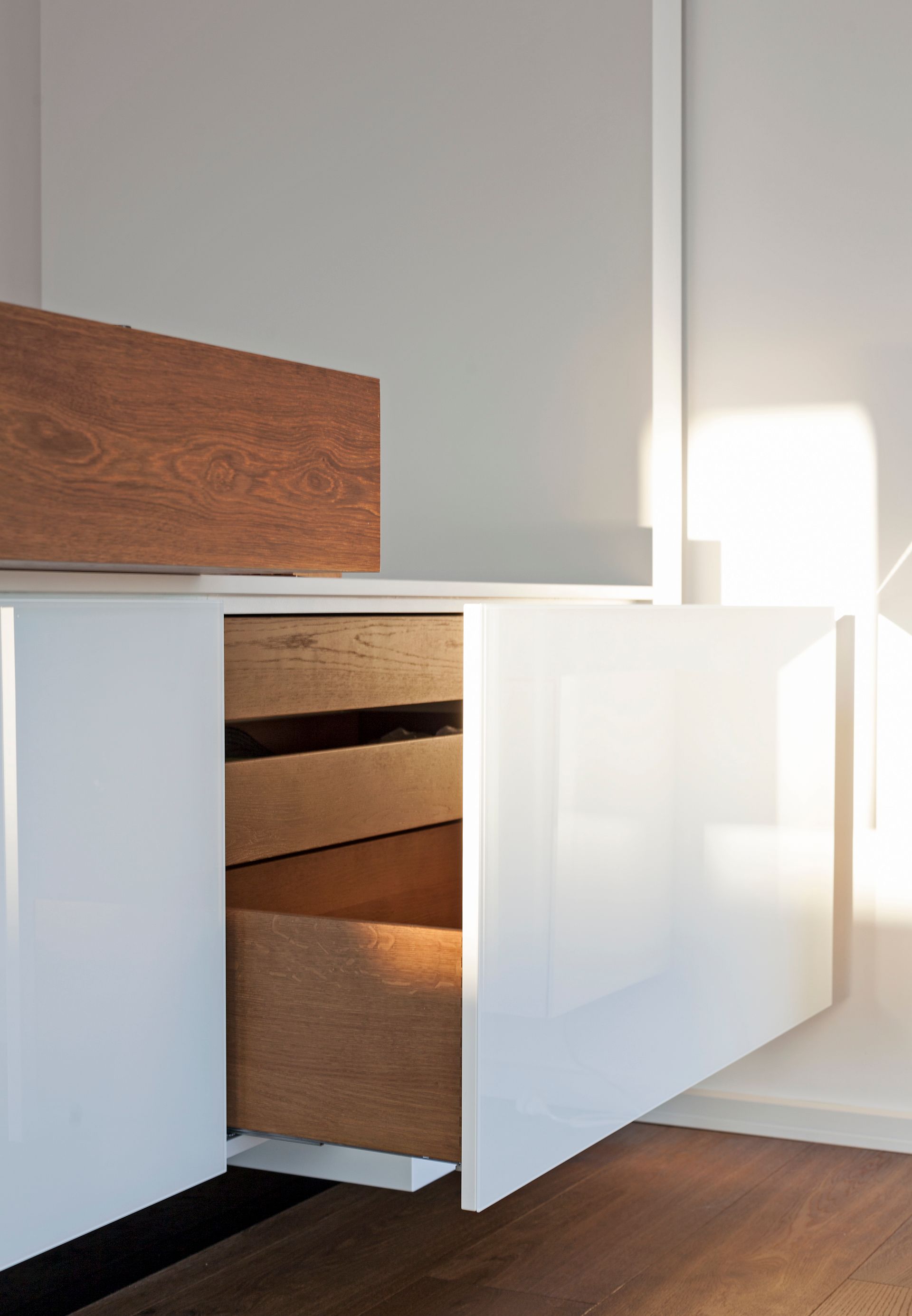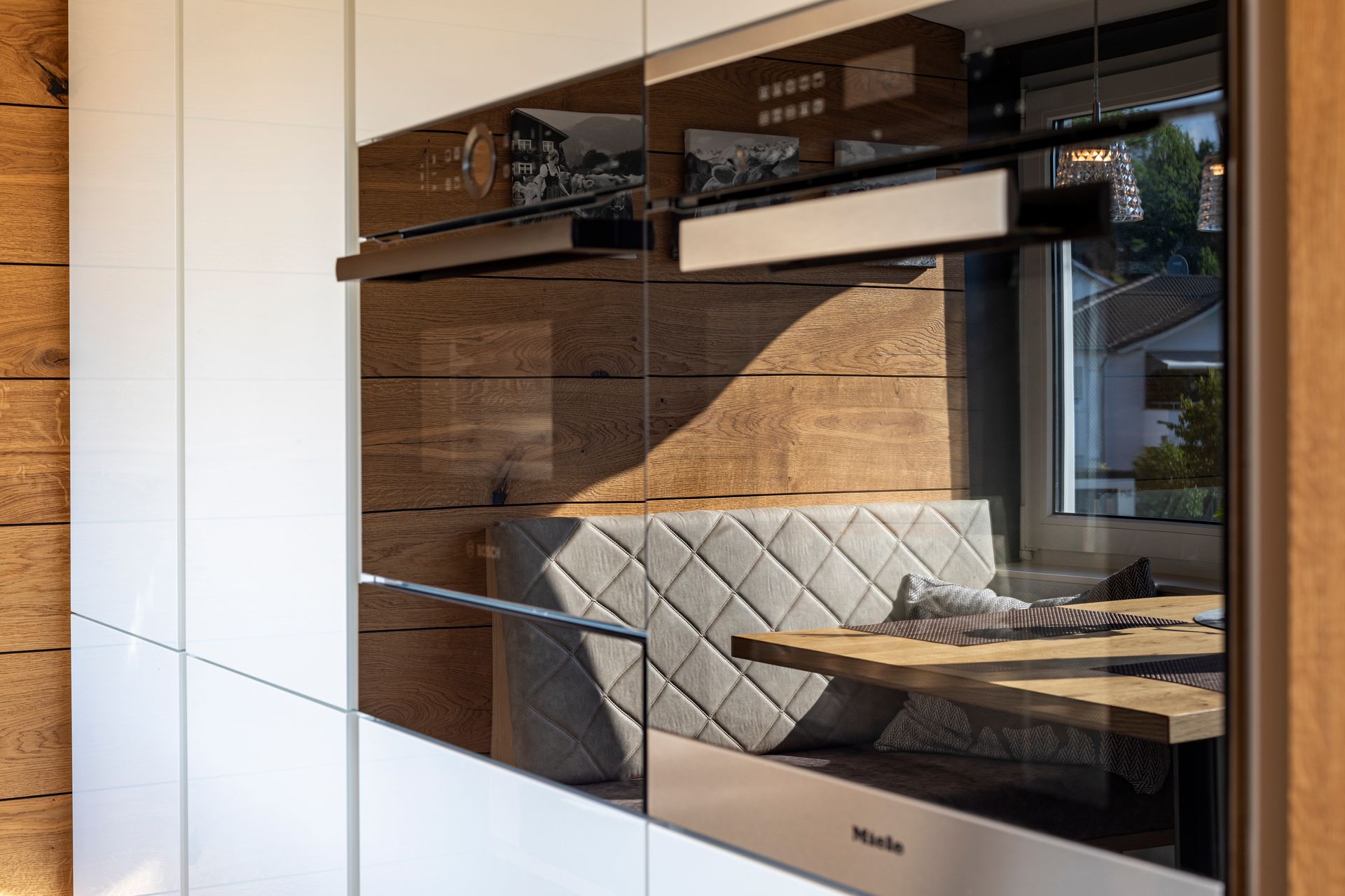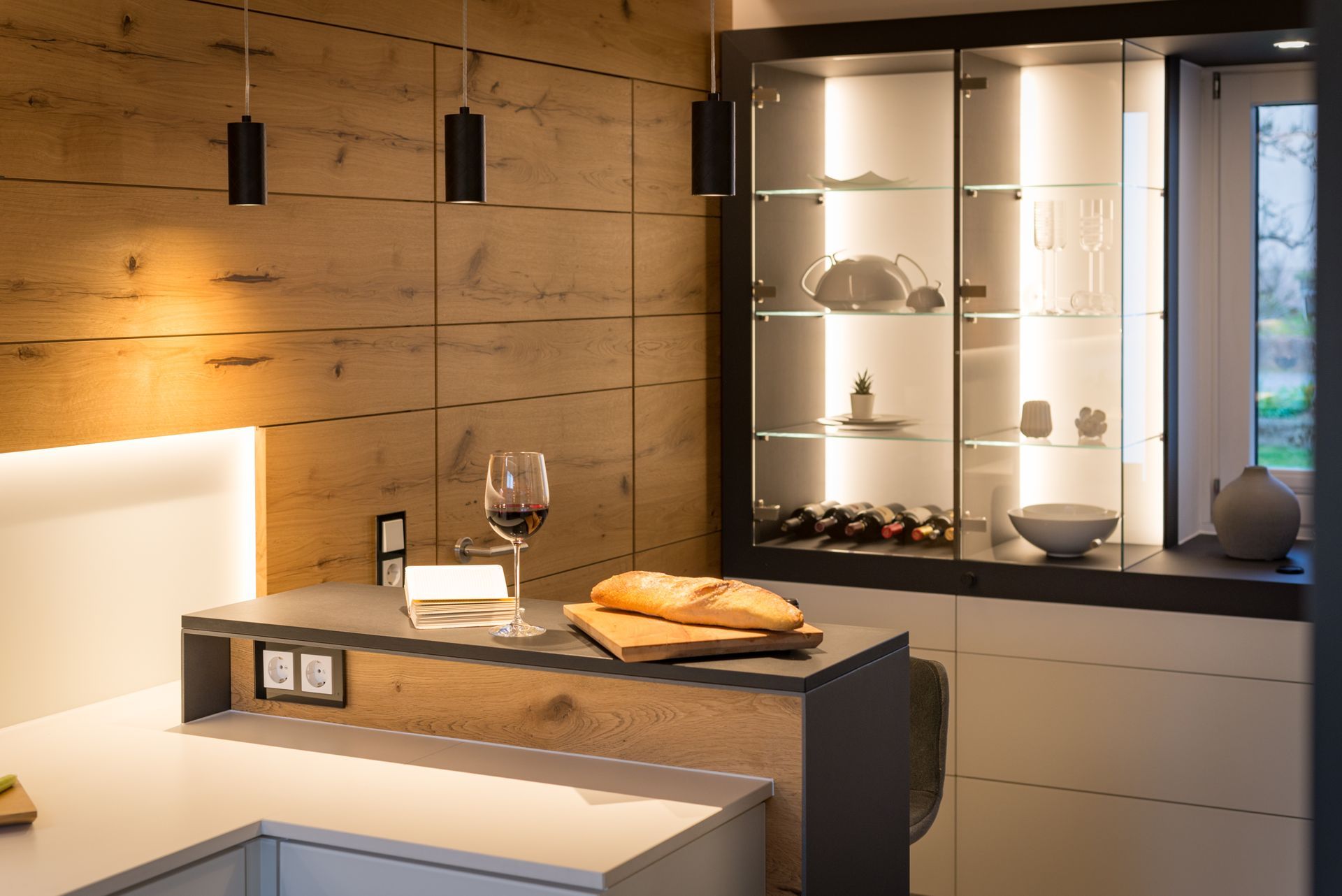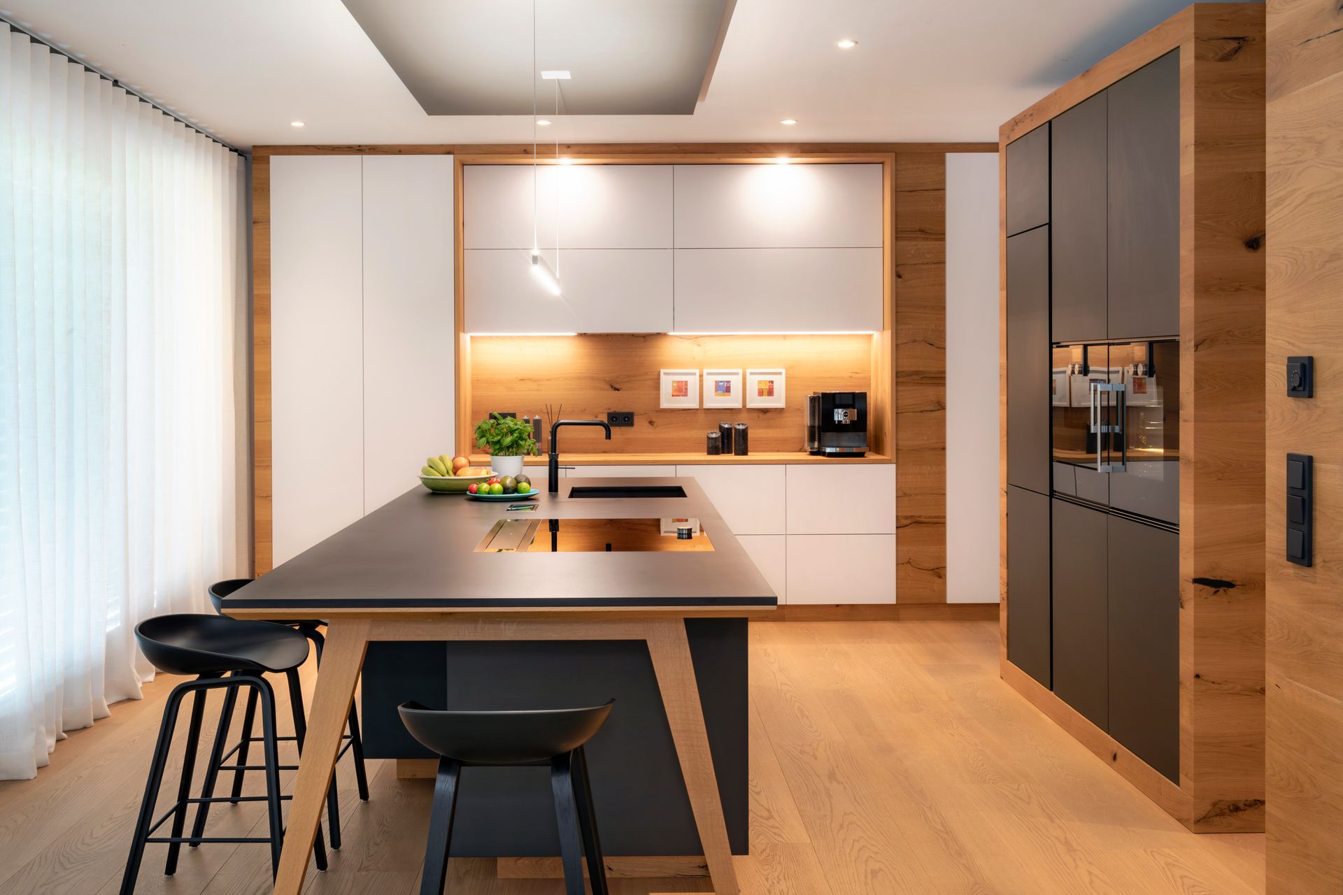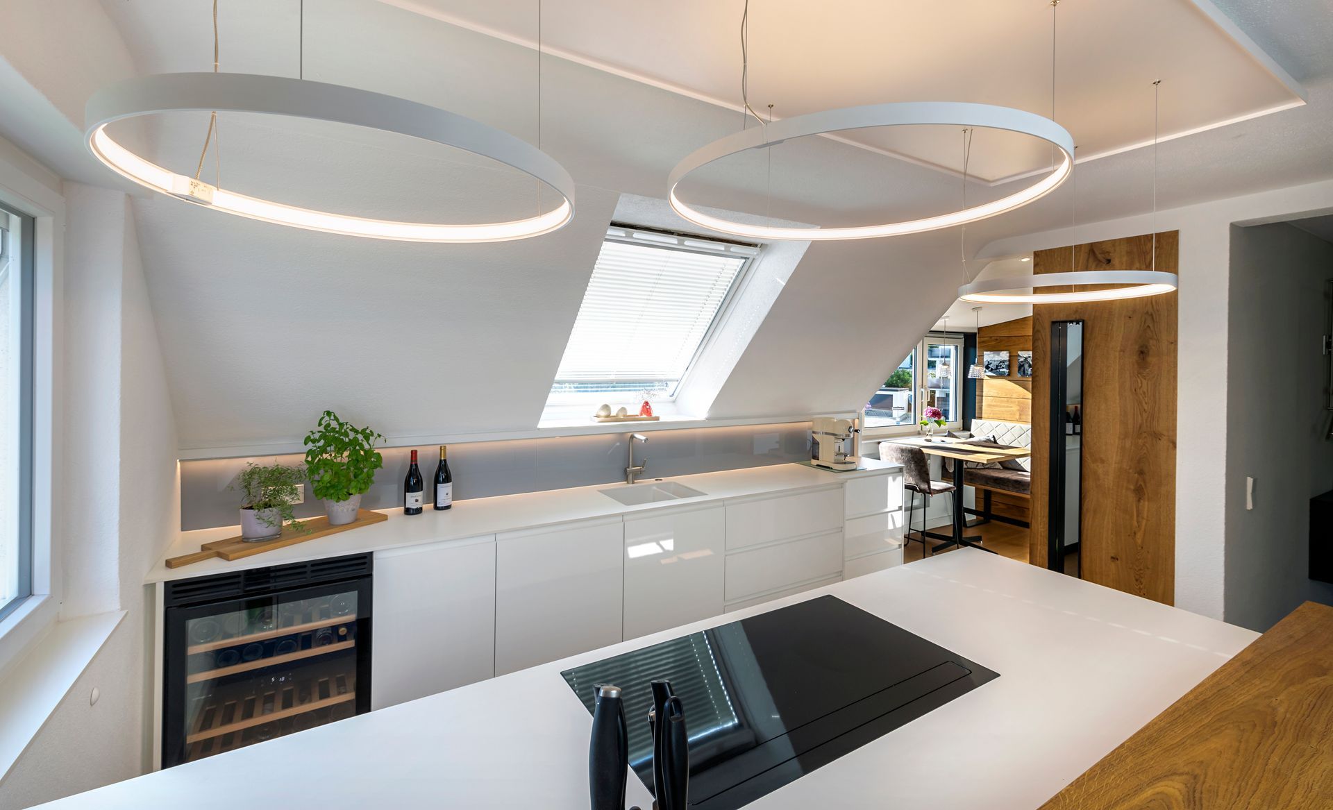 Ein exklusives Wohnhaus und ein Projekt, das uns von der Planung bis zur Ausführung beinahe drei Jahre begleitet hat. Das Highlight: Das Sideboard im Wohnzimmer, mit gesamt 7 Metern am Stück und ein zweites ums Eck anschließend mit 5 Metern am Stück – beide in weiß hochglanz.