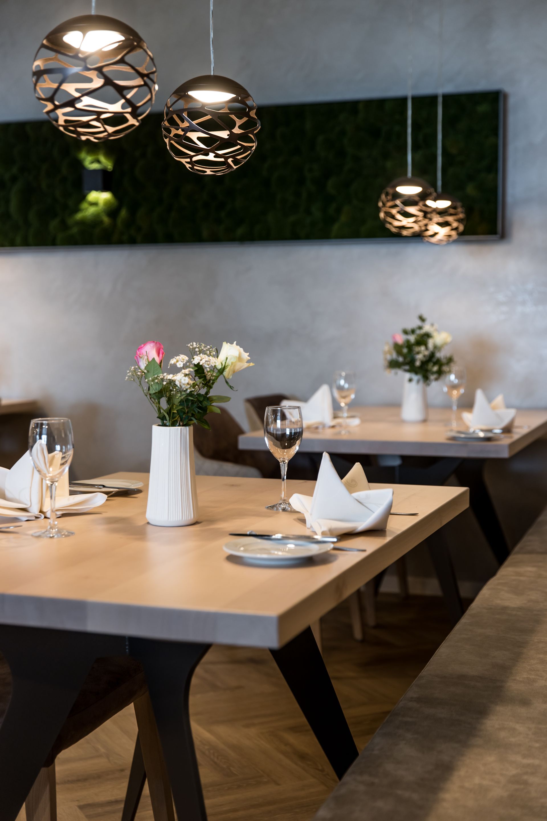 Das Hotel Knoblauch ist ein modernes Familiengeführtes Hotel, was sich auch in der Inneneinrichtung widerspiegelt. Das neu gestaltete Restaurant zeigt Mut zur Farbe und ist definitiv ein Blickfang und ein Ort zum Wohlfühlen! Entwurf und Planung: Innenarchitektin Ursula Heim, Umsetzung und Montage: Firma Robert Dauwalter.